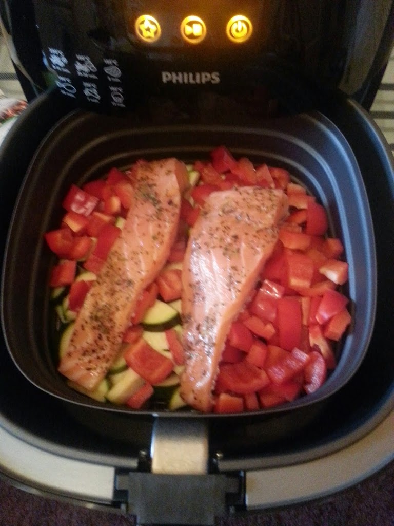 Nachdem ich alles ausgepackt & einmal kurz durchgespült habe, ging es dann gleich los. Ich habe Gemüse geschnippelt (Paprika und Zuccini) und in die “Fritteusenschublade” gelegt. Darüber habe ich ein paar Gewürze gestreut und dann noch Lachs dazu gelegt, den ich fertig mariniert gekauft habe. Für mich sieht das wie eine Schublade aus, aber seht selbst: